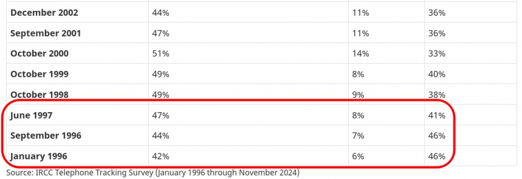 In the mid-90s, anti-immigration sentiment in Canada was also nearing 50%